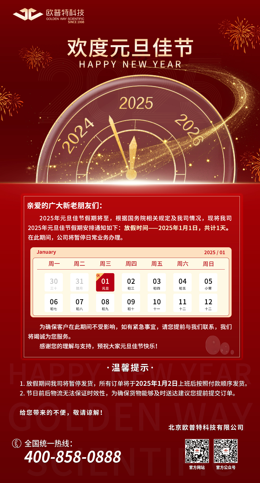 北京欧普特科技有限公司2025年元旦放假通知