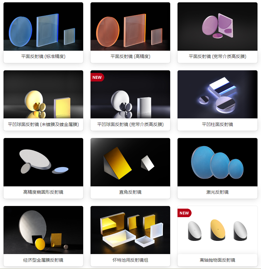 作为专业的光学反射镜服务商,欧普特构建了完整的光学反射镜产品矩阵,涵盖多种类型与规格,全面覆盖市场多元需求。其中包括平面反射镜系列,既有满足基础应用的标准精度平面反射镜,也有适配高精度场景的高精度平面反射镜,还有具备优异反射性能的宽带介质高反膜平面反射镜;平凹球面反射镜系列涵盖未镀膜及镀金属膜、宽带介质高反膜等多种类型,可根据不同应用场景的光线反射需求灵活选择;同时还提供平凹柱面反射镜、高精度椭圆形反射镜、直角反射镜、激光反射镜等专用产品,适配激光系统、精密成像等特定领域的使用需求。